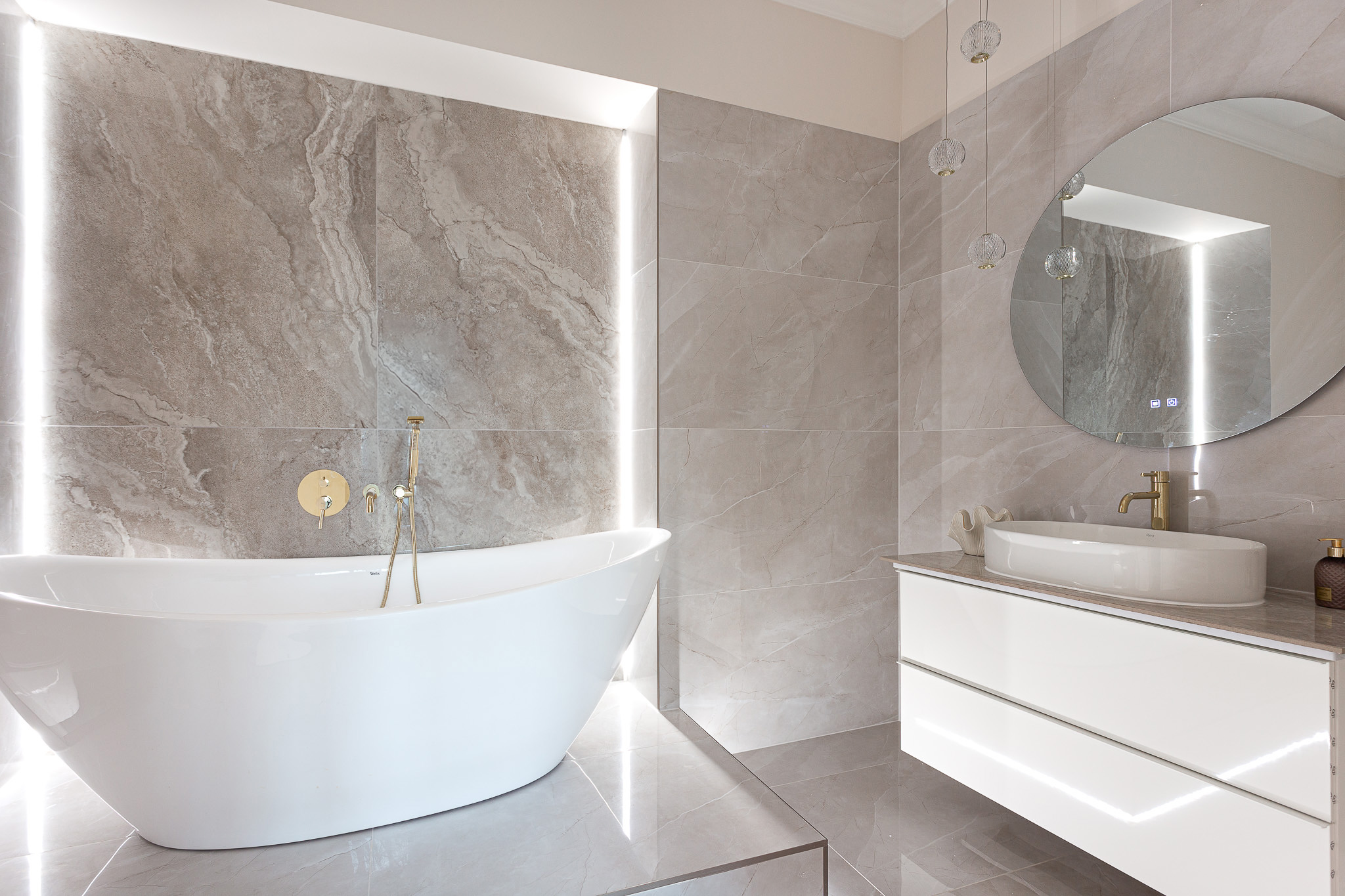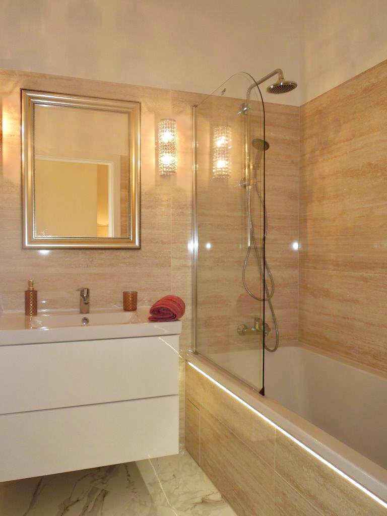 The retro-style bathroom was replaced with a bathtub-shower combo, a large mirror, warm marble-patterned tiles, and LED lighting.