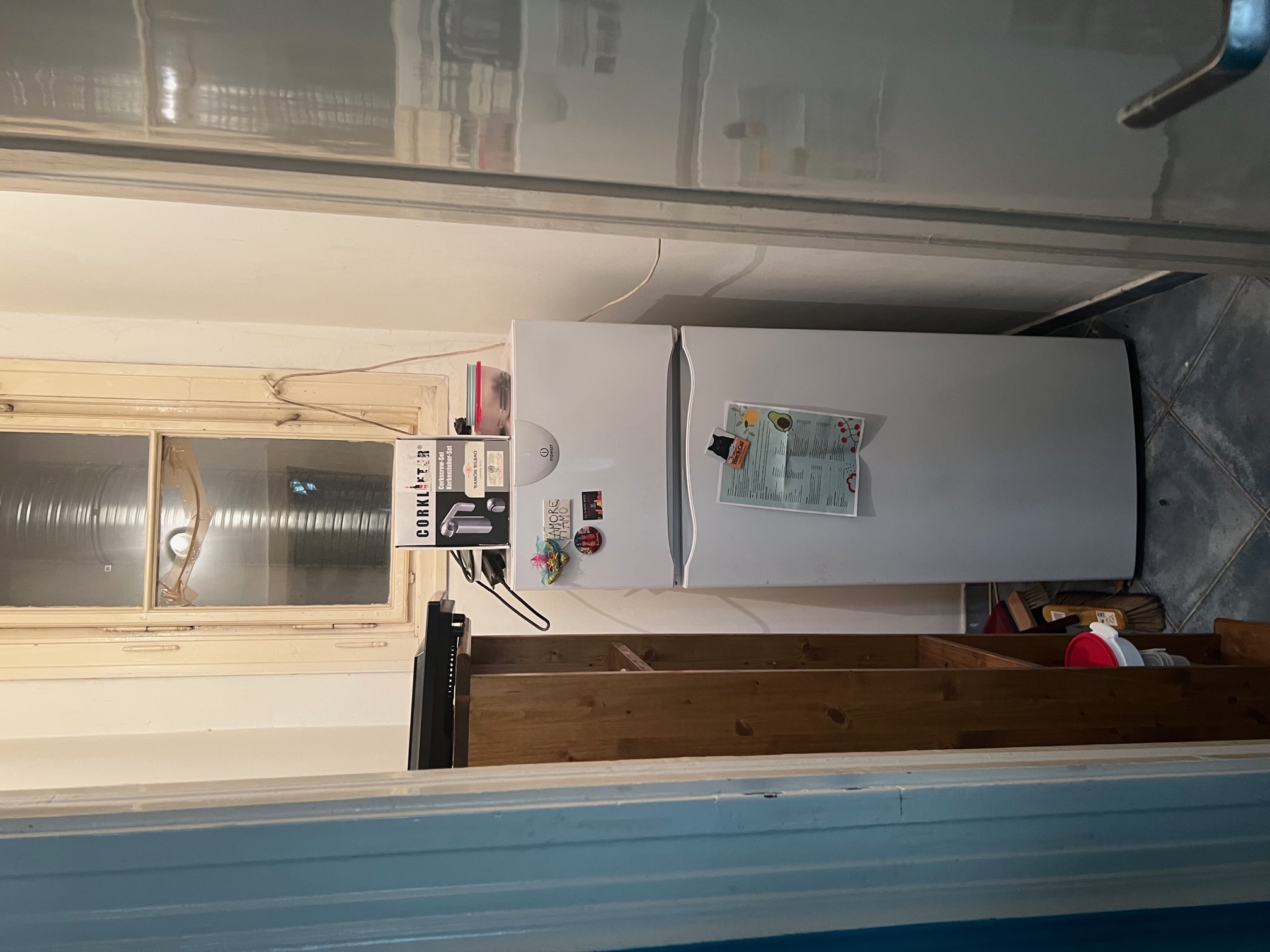 The high ceiling allowed for the construction of a mezzanine, where the double bed was placed, creating space for a four-person dining table underneath.