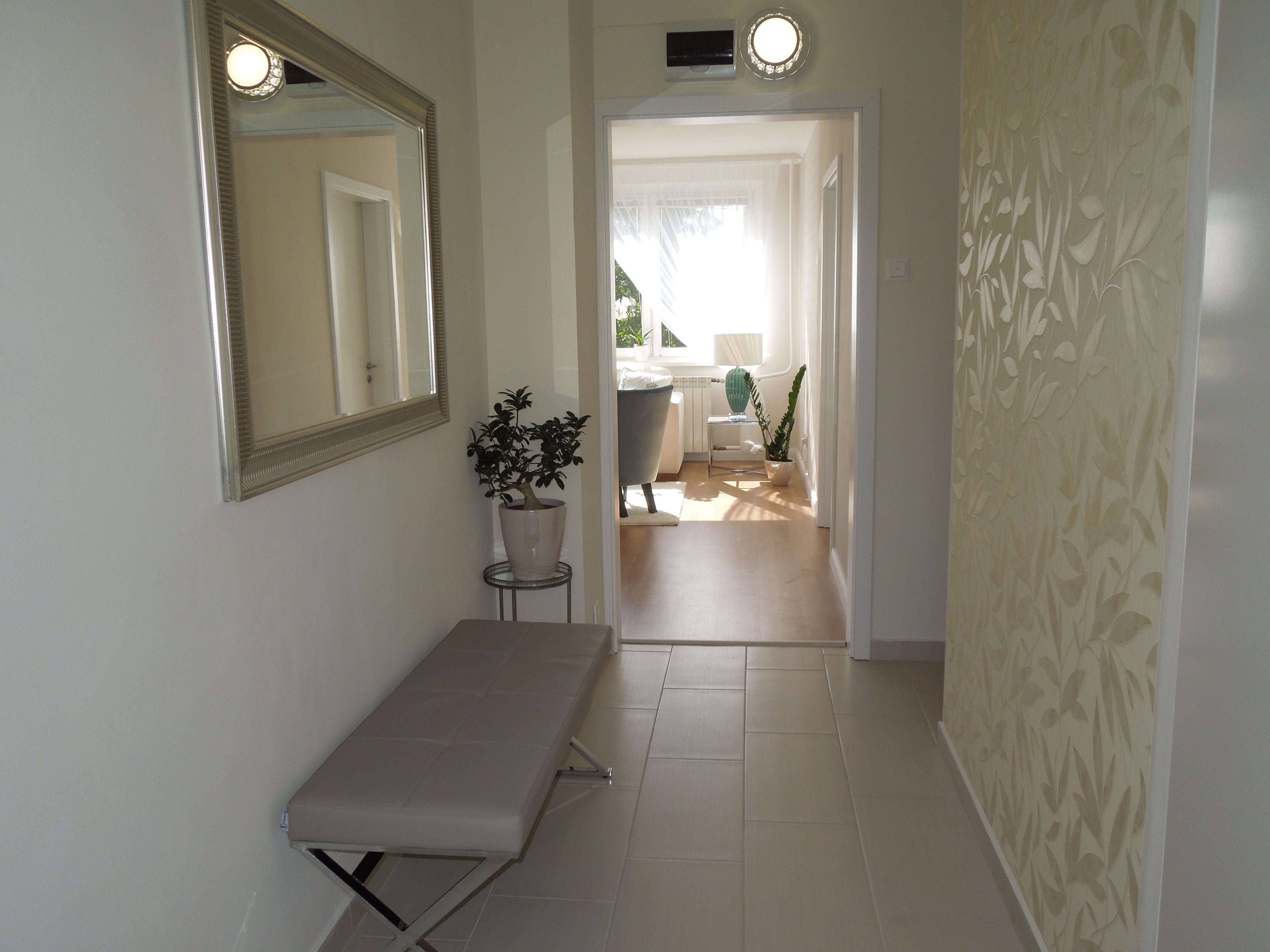 The narrow and cramped entrance hall was transformed into a spacious, clean, and bright area.