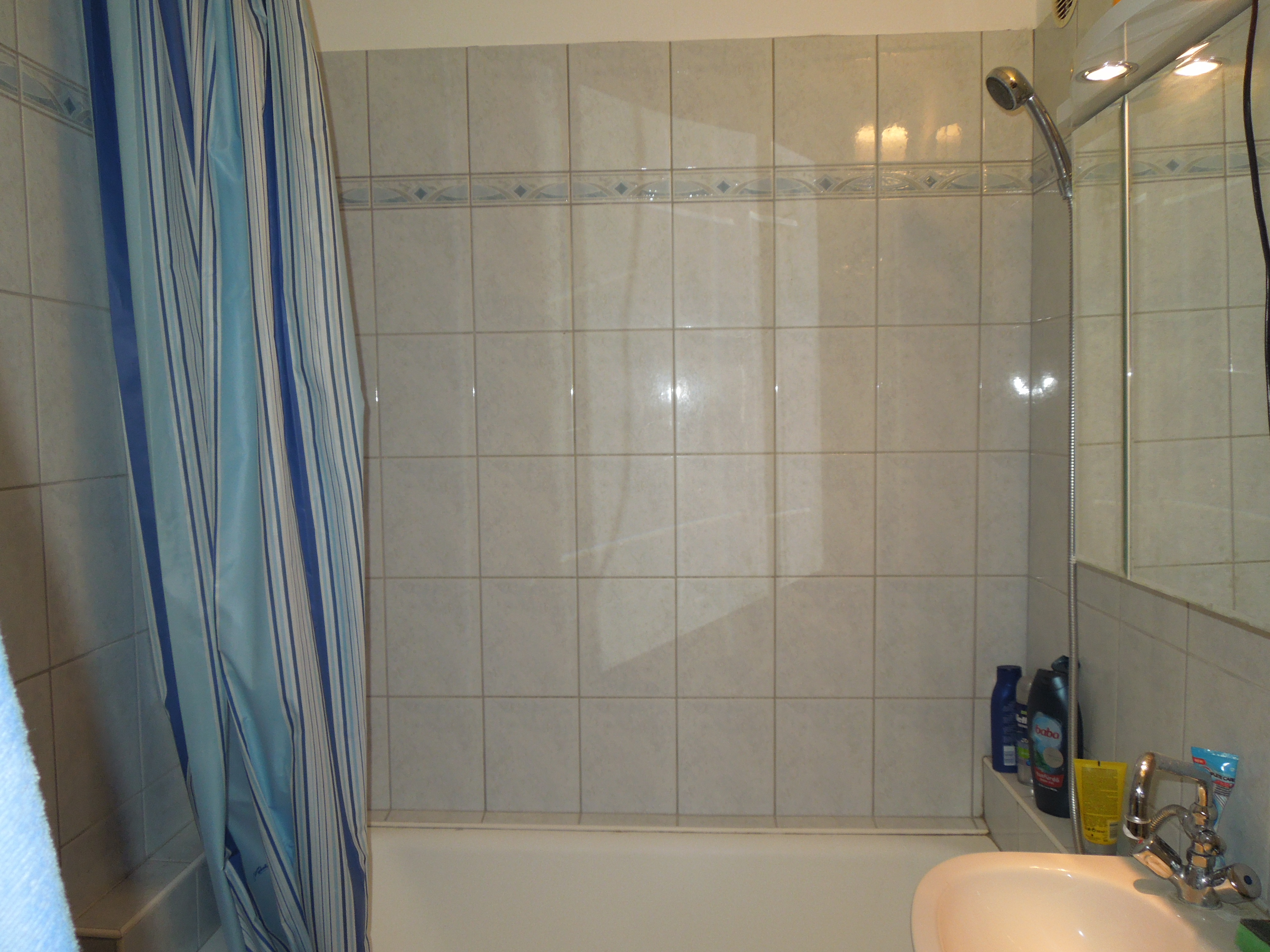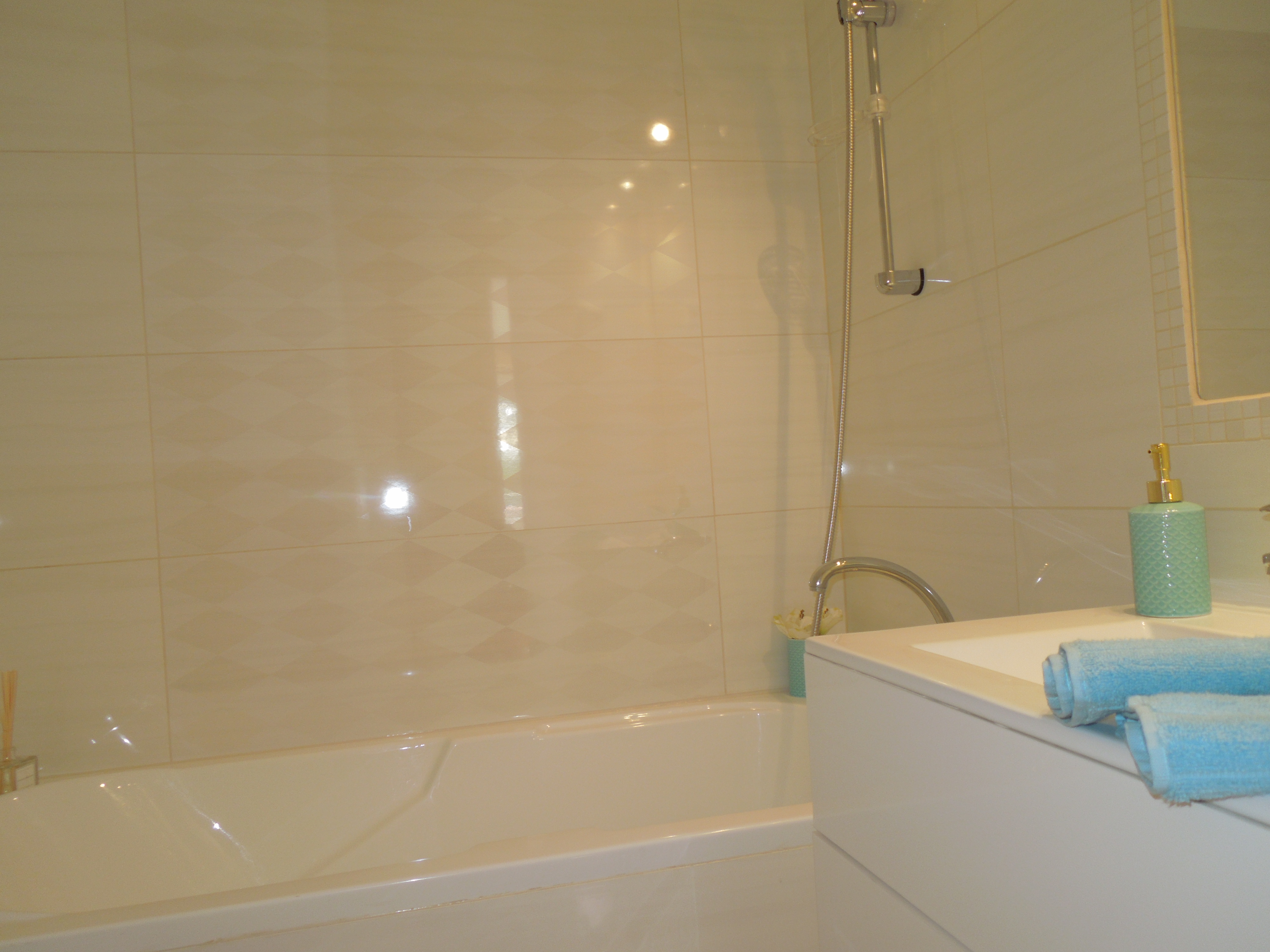 Even the tiny bathroom was upgraded with a new bathtub, sink, and tiles.