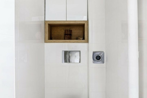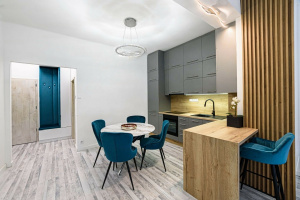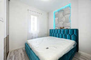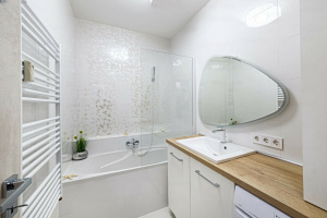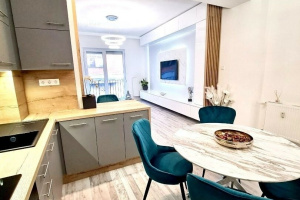 The interiors feature high-quality modern finishes, including sound- and heat-insulated windows with blinds. The apartment is air-conditioned.