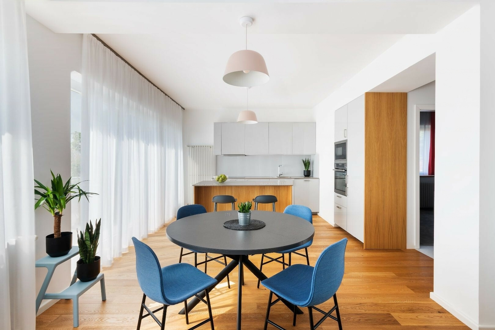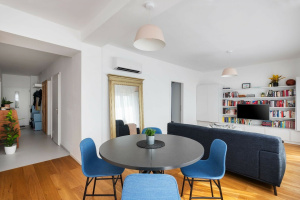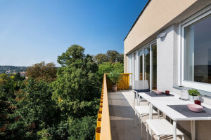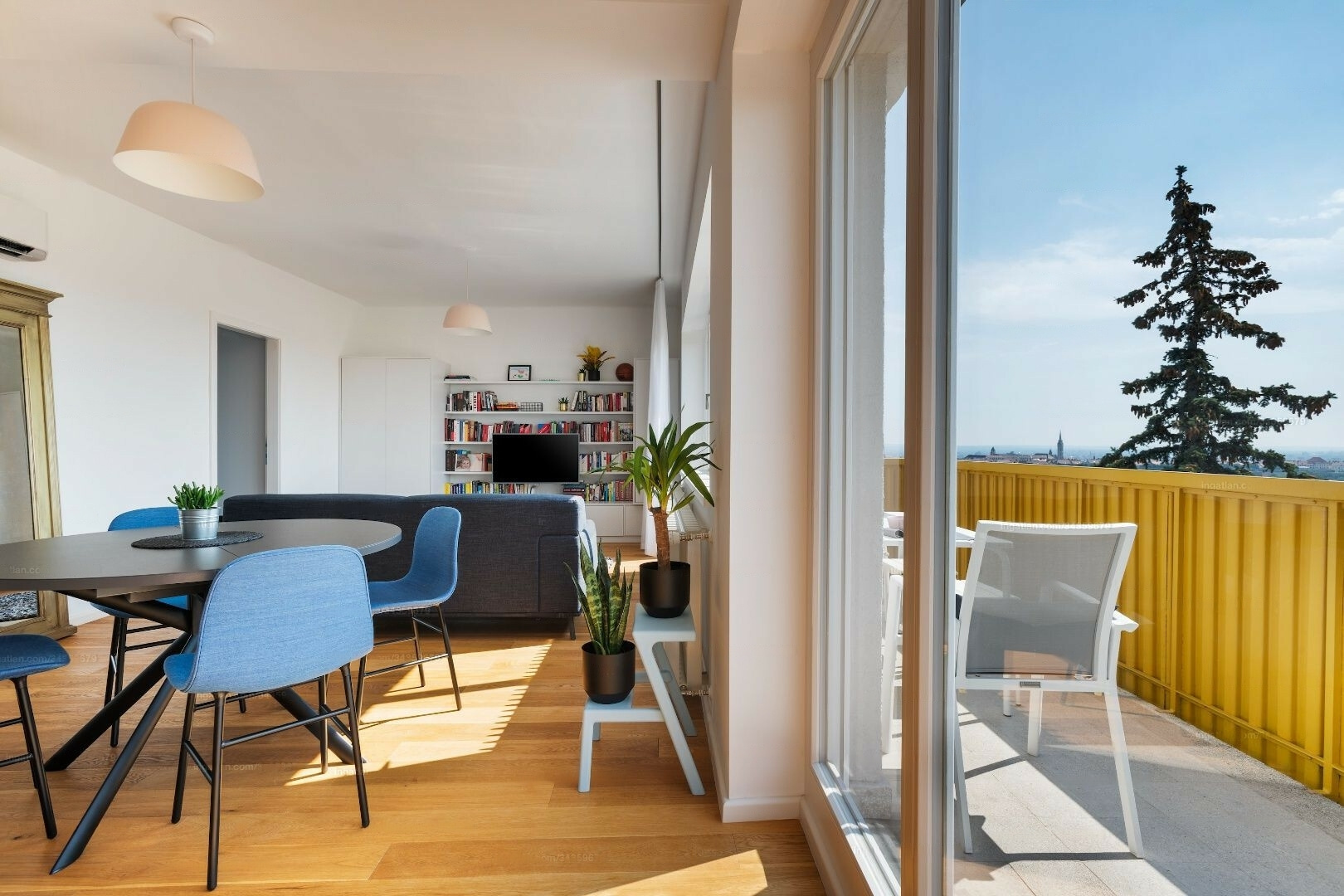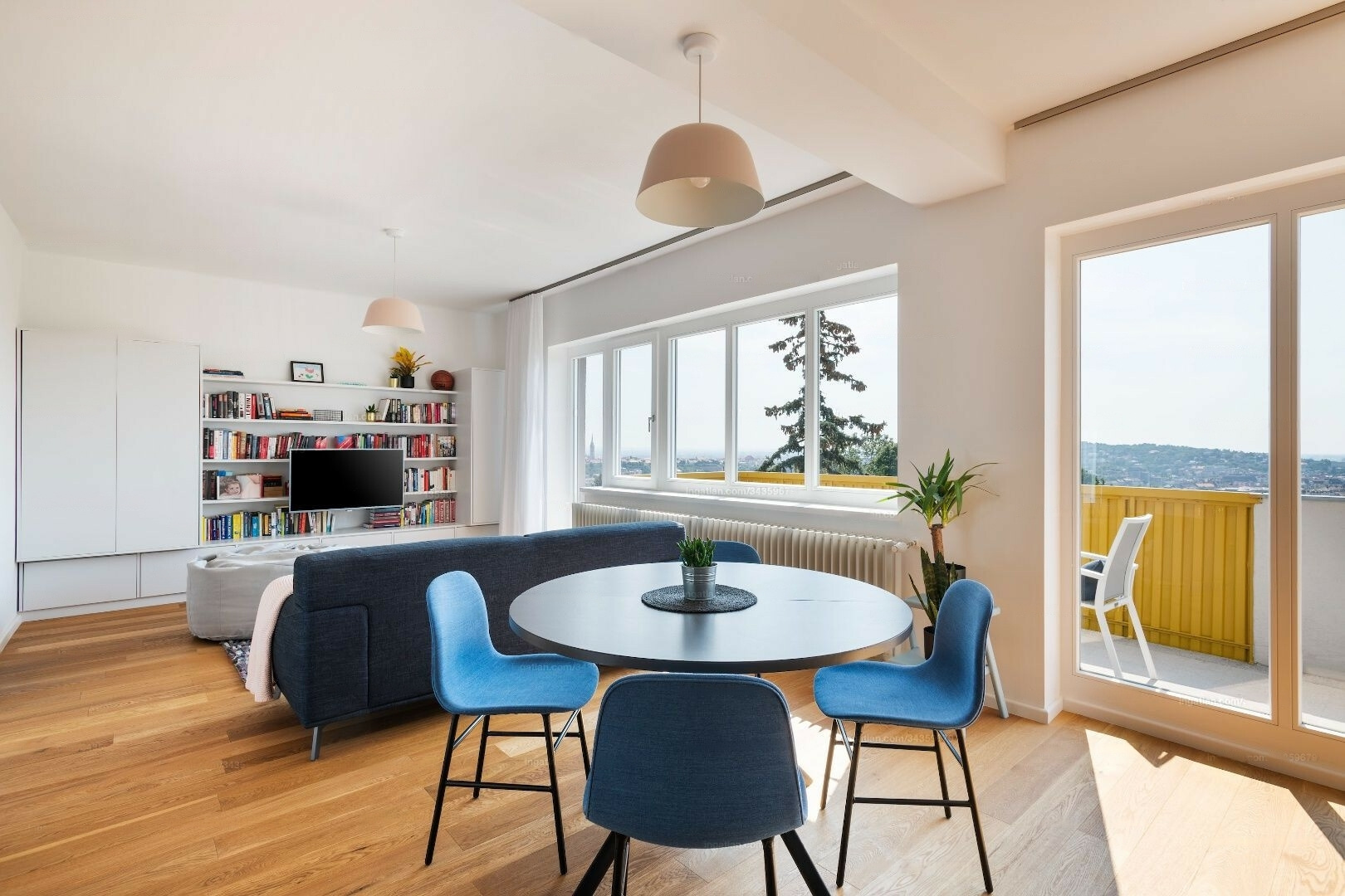 This renovated apartment with a panoramic view is for sale in a quiet neighborhood near the city center and Kis-Svábhegy Nature Conservation Area. The condominium sits on an 800 m² lot and was built in the 1960s. The area is peaceful, and the community is close-knit, reflected in the steady progress of the building’s renovations.