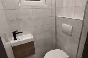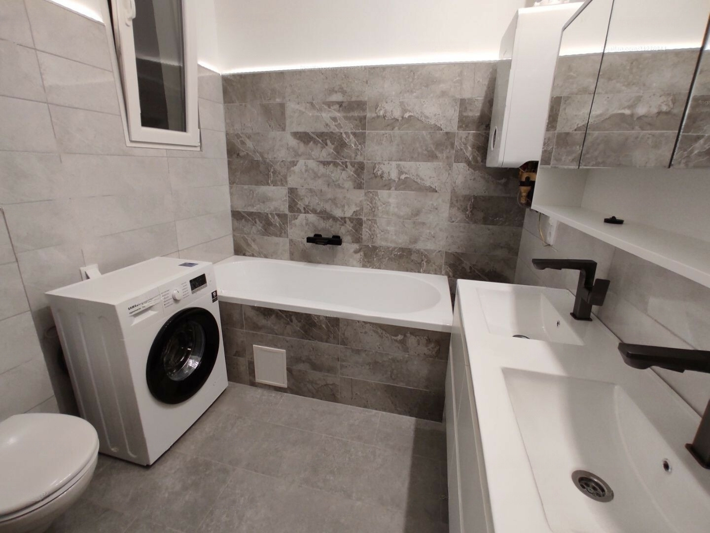 The apartment has 2 toilets, a bathroom with a bathtub, double sinks, extractor fan, and a window. Every room is equipped with LED mood lighting with adjustable brightness and color via remote control.