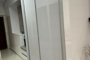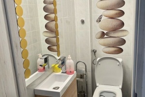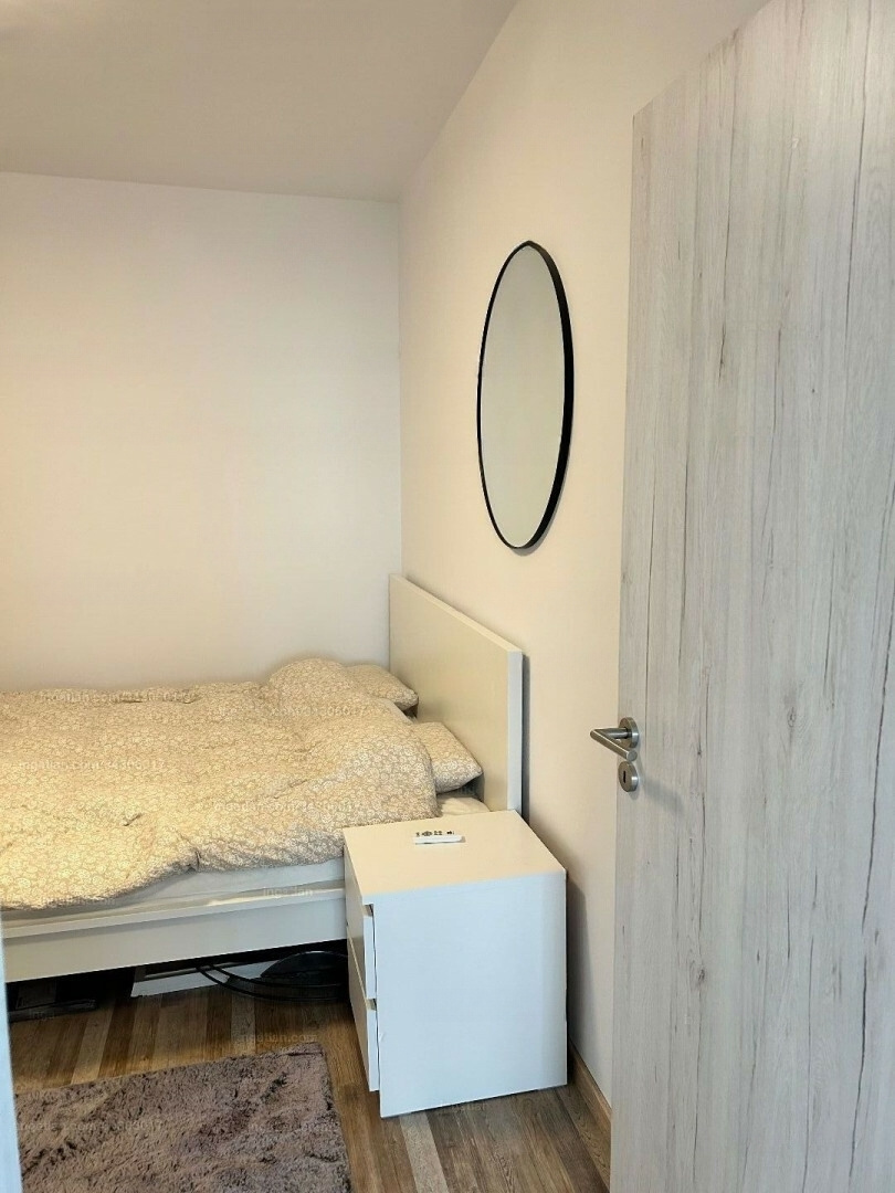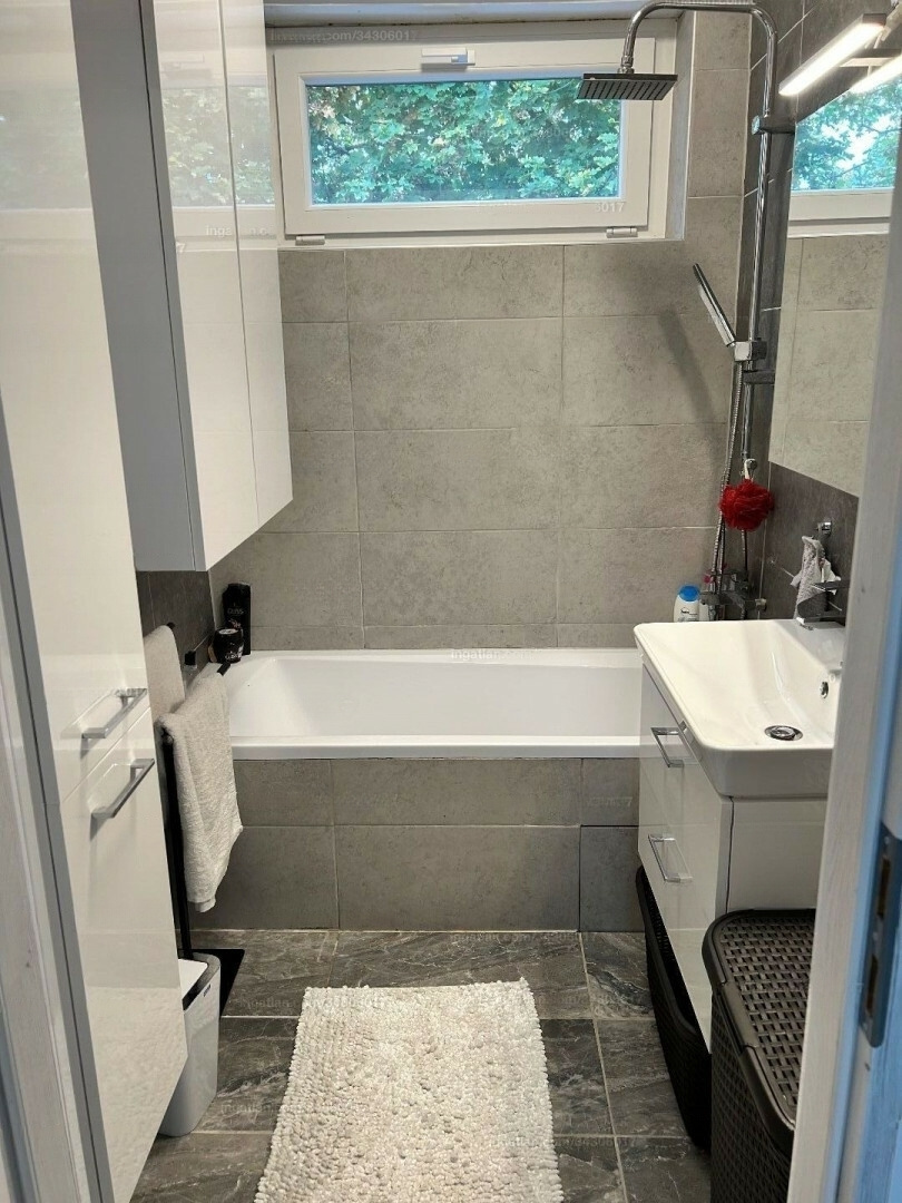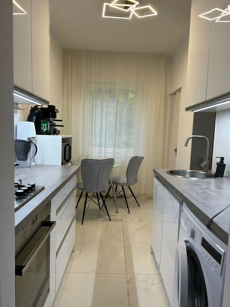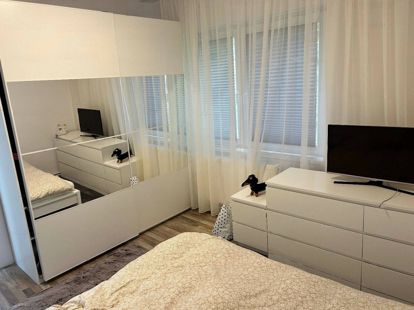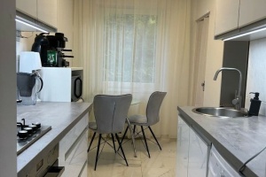 During the renovation in 2022, the apartment received new plastic windows, interior doors, a fresh paint job, an inverter air conditioning system (for heating and cooling), new flooring (both tile and wood), a modern BOSCH condensing gas boiler with chimney lining, new sanitary ware, and custom-made high-gloss and natural white built-in furniture.