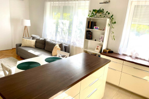 The apartment is beautifully renovated and features an open-plan living room with an American kitchen and 1.5 bedrooms. There is a separate bathroom and toilet, as well as additional storage space provided by a pantry and a separate basement.
