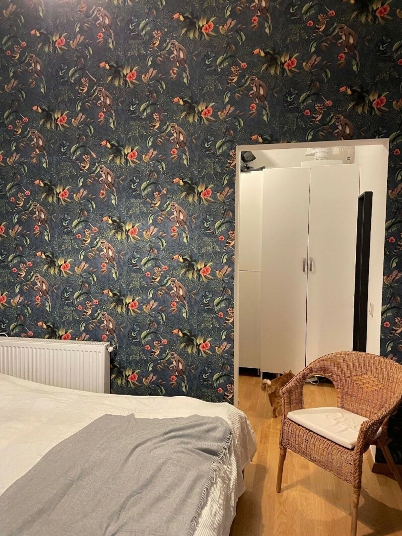Entering from the impressive hallway, you find a large living room with an American kitchen, which features a separate sleeping alcove and wardrobe. The living room is bright and airy, with large, west-facing windows that allow for abundant natural light throughout the day.