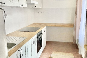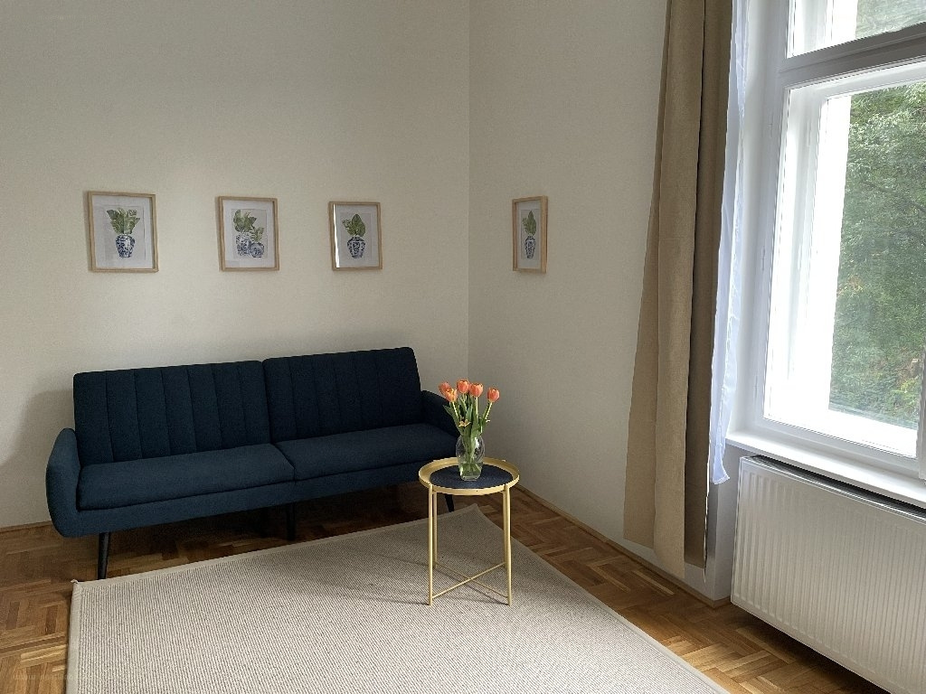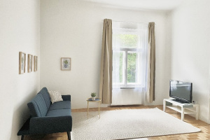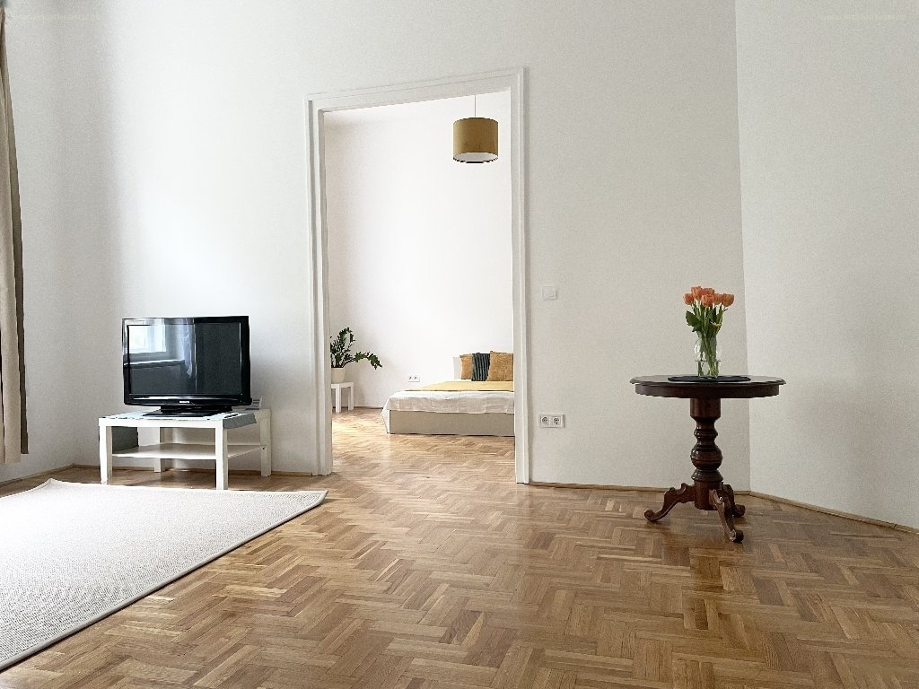 This owner-listed apartment is within walking distance of the city center and features two rooms, a hall/dining area, a separate kitchen (which can easily be converted into an additional room), and a bathroom. Located on the 2nd floor of a lift-equipped building, the windows overlook the green canopy of trees in summer and, in winter, the restored Palace of Archduke Joseph can be seen behind the trees.
