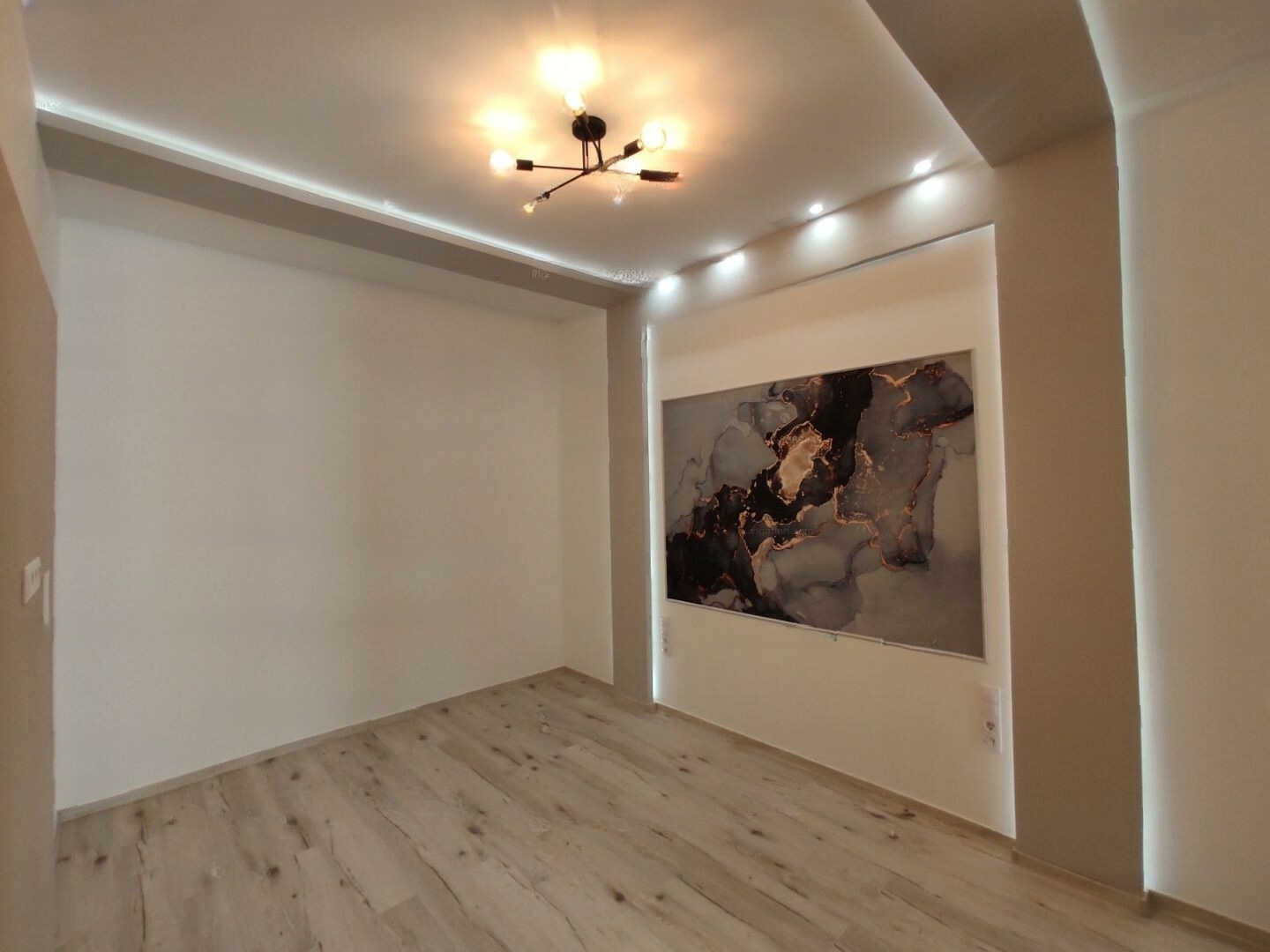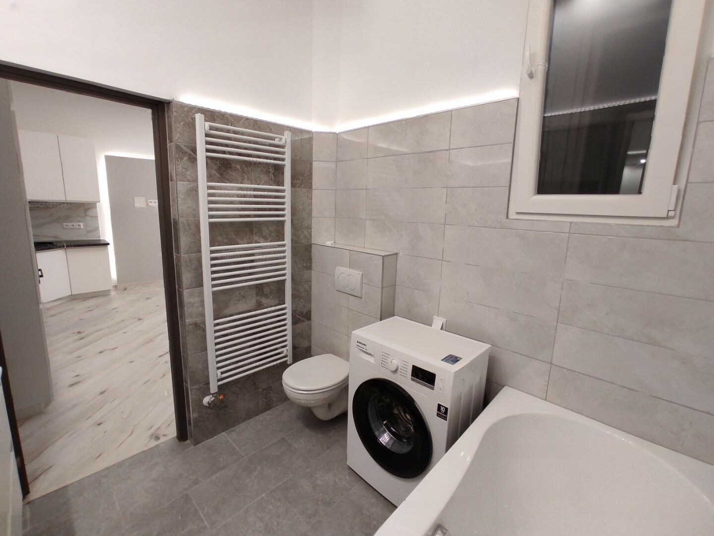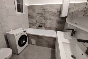 The apartment has 2 toilets, a bathroom with a bathtub, double sinks, extractor fan, and a window. Every room is equipped with LED mood lighting with adjustable brightness and color via remote control.